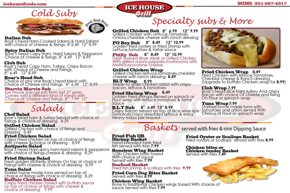 . Diners Chicken Wings Sandwiches 321 225-8934. 3 piece served with house made jalapeno raspberry sauce. Latest reviews photos and ratings for Ice House Grill-Titusville at 2850 S Washington Ave in Titusville - view the menu hours phone number address and map.